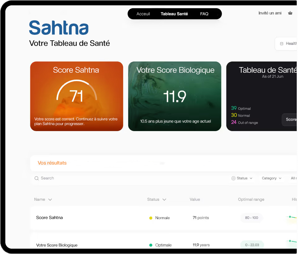 Retrouvez vos biomarqueurs, valeur par valeur, avec l’intervalle de référence et une explication simple de ce que mesure chaque marqueur. L’IA Sahtna met en évidence les points à surveiller selon votre profil, puis traduit vos résultats en un plan d’action personnalisé, combinant habitudes au quotidien et pistes de compléments.
